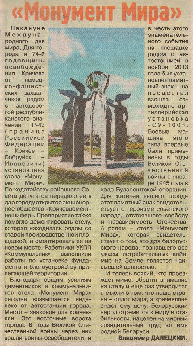 Далецкий, В. "Монумент мира" : накануне Международного дня мира, Дня города и 74-й годовщины освобождения Кричева от немецко-фашистских захватчиков рядом с автодорогой республиканского значения Р-43 установлена стела "Монумент мира" / Владимир Далецкий // Кричевская жизнь. – 2017. — 23 верасня. — С. 1.